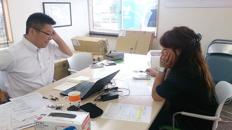 中島と江口はどうしたら、お客様と、乗務員、そして会社がwin,win,winになるか数字とにらめっこ中のヒトコマです。ほんと難しい緻密な計算をして、運賃を決めて見積りを作ったりしています。この日は、あるドライバーの給料のベースアップが課題で、そのドライバーのスキルと見あった運行の組合せを、あらゆる角度から精査してベストな組合せを思案していました。