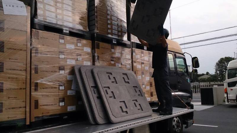 「フォークリフトで積み込み後、何やら短く編まれたロープを持ってきて、アオリを吊ったSさん、その上を軽快に歩き、サクサクと緩衝材を隙間に入れてくれました。」