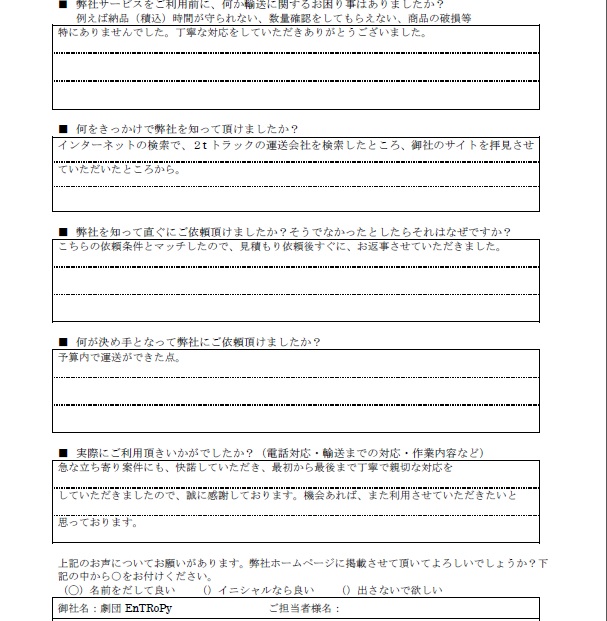 荷主G様よりアンケートにお答えいただきました。